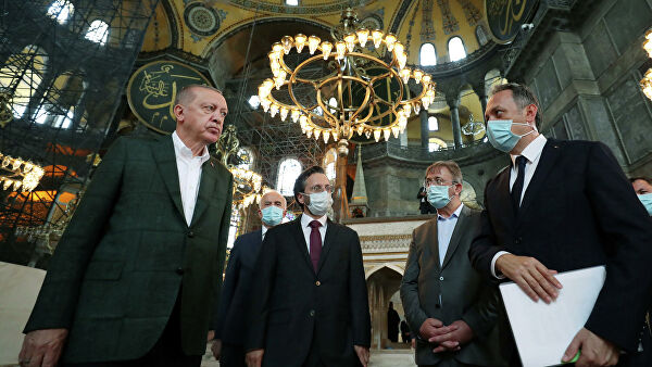 Како је саопштено у Анакри, да би се упознао са припремним радовима за први муслимански намаз – након што је великој православној светињи одузео статус музеја који јој 1934-те био дао Кемал Ататурк.