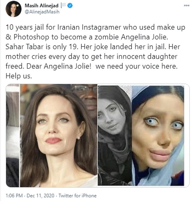 Написала је: „Сахар Табар има само 19 година. Шала ју је одвела у затвор. Њена мајка свакодневно плаче и моли да буде ослобођена њена невина ћерка. Драга Анђелина Џоли! Потребан нам је ваш глас. Помозите!“
