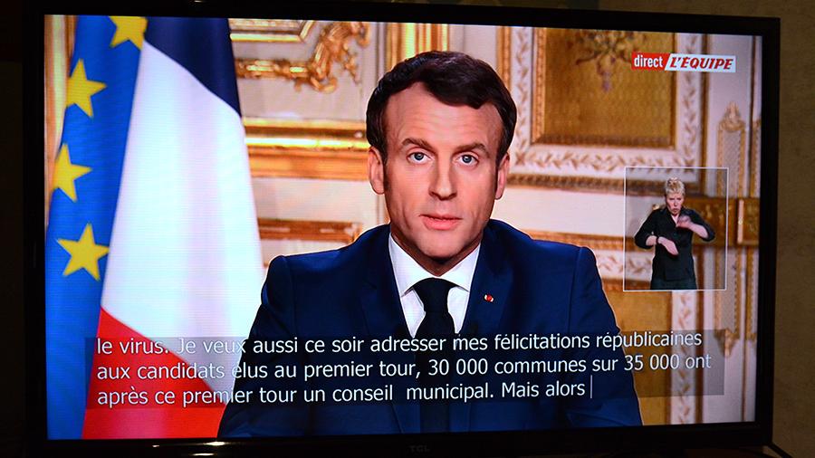 * „Претња коронавируса постала је реалност. Ми смо сада у стању санитарног рата. Наш непријатељ је невидљив али надире. Молим вас да остајете у својим кућама и да сачувате спокојство. Морамо себе заштитити у дугој перспективи. Сви Французи, који се налазе у иностранству, могу се несметано вратити у своју земљу“