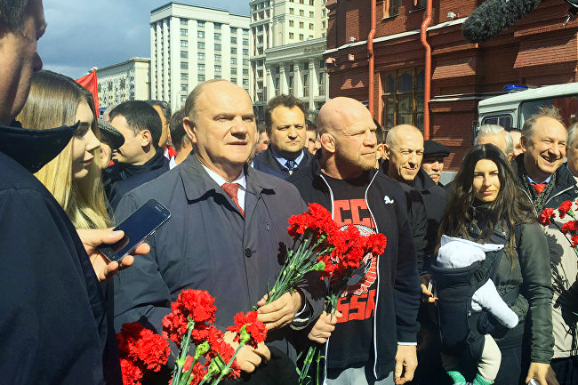 У мајци на којој пише „СССР“ (на руском и енглеском) - Монсон је заједно са лидером КПРФ, Генадијем Зјугановом, посетио Лењинов маузолеј на Црвеном тргу.