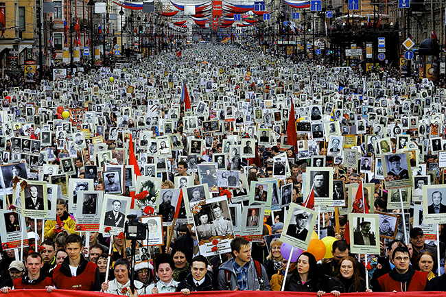 У овом овековечивању подвига предака само у Москви је учествовало преко пола милиона људи. У Санкт Петербургу (на слици) најмање 250.000. А по целој Русији - око 12 милиона!