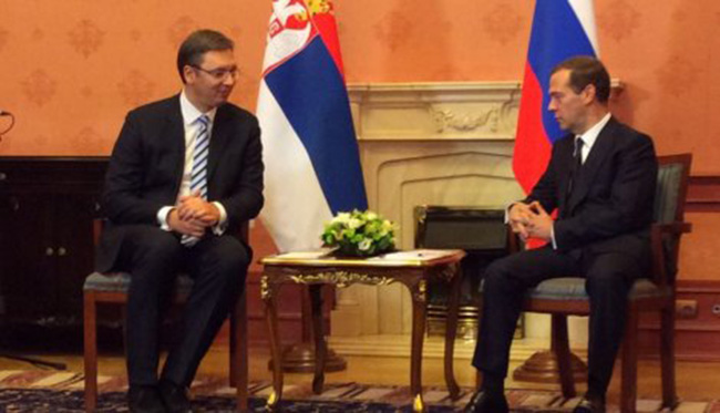 - ПРЕМИЈЕРИ Русије и Србије Дмитриј Медведев и Александар Вучић оценили су данас после разговора у Москви да су односи две земље традиционално добри и пријатељски и заложили се за јачање сарадње посебно на економском плану.