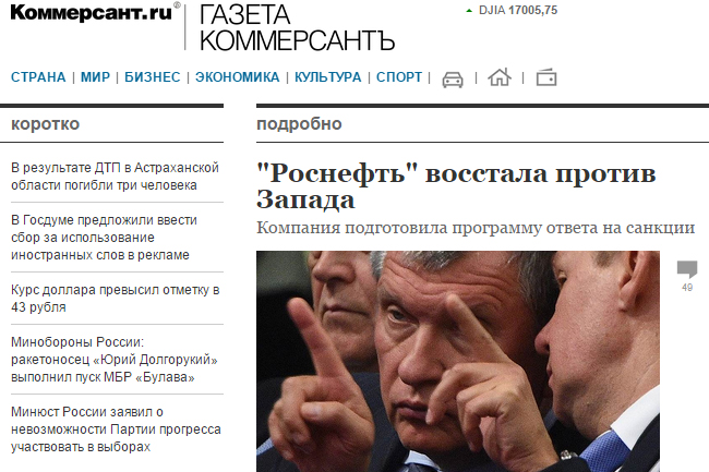 - „Комерсант“ штампао да највећа руска нафтна компанија предлаже - поред осталог - заплену имовине западних земаља и њихових држављана у Русији као меру обезбеђења за неизвршене уговоре. Уз наглашавање да САД из године у годину без дозволе суда заплењују имовину целих земаља и појединих компанија и да то чине само на основу декрета председника САД