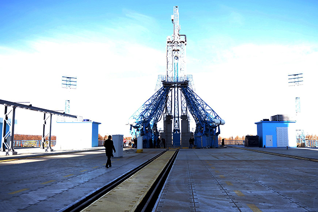 - У лансирном комплексу шефу руске државе показан је мобилни торањ за одржавање: он омогућава да се изводе сви радови на припреми ракете-носача за лансирање у најсложенијим климатским условима. Висина торња је 52 метра, тежина - 1600 тона, торањ има седам нивоа