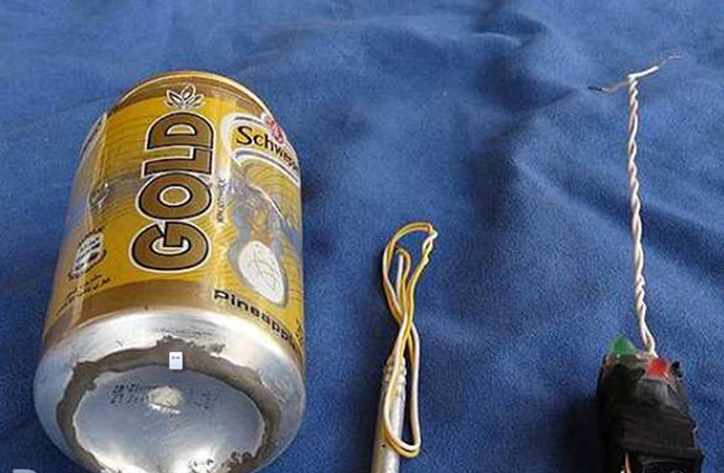 На снимку се виде конзерва од Schweppes Gold и нешто што би могло да буде детонатор.