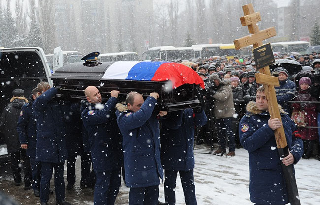 Како је истакао главнкомандујући ВКС Русије Виктор Бондарев, који је присуствовао опроштају, руски пилот је погинуо због „издајничког пуцња у леђа од стране турског ратног ваздухопловства и руководства Турске“.