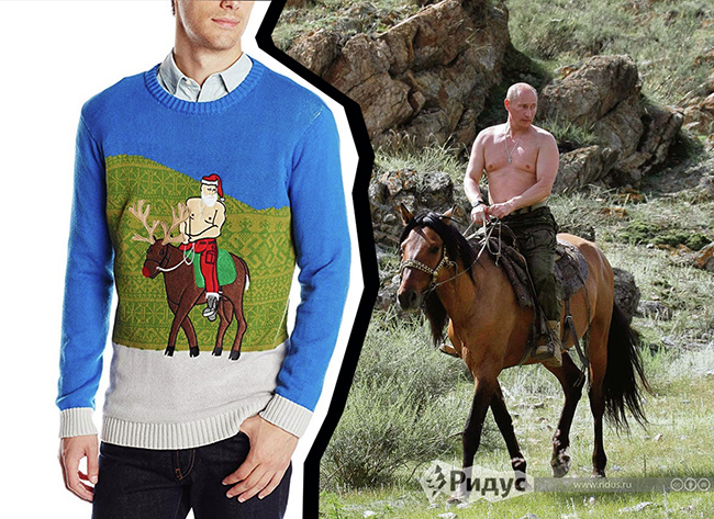 Сасвим конкретно: онај ко је дизајнирао џемпере за Amazon прекопирао` је чувену фотографији на којој Путин – са обнаженим горњим делом тела – јаше на коњу. Чак је и глава Санта-Клауса-Путина у истом положају и са истим погледом.