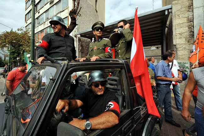 Двојица демонстраната обучена у немачке војне униформе развили су црвено-црно-белу заставу са кукастим крстом и нацистички поздравили у тренутку када је на атински аеродром слетао авион Меркелове.
