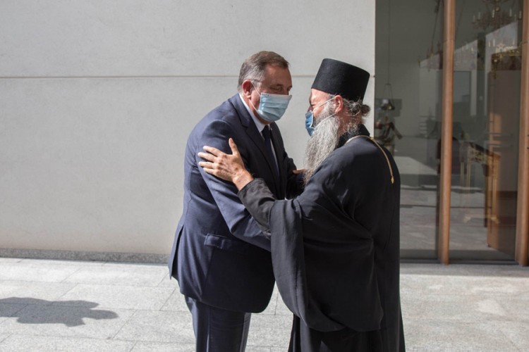 Додик је митрополиту Порфирију уручио донацију Владе Републике Српске од 100.000 евра за обнову Саборне цркве Преображења Господњег у Загребу, која је страдала у земљотресу.