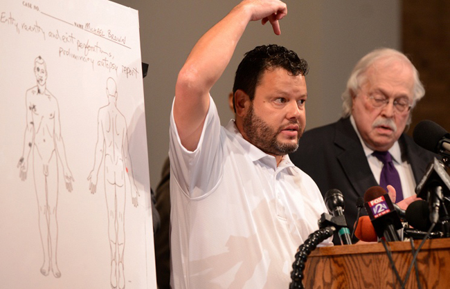 - Улазне ране од метака на несумњив начин су показале да је Браун према свом убици – полицајцу Дарену Вилсону – био окренут лицем. Ово је демантовало изјаве неких сведока који су полицији рекли да је млади црнац Вилсону, у моменту када је почео да пуца, био окренут леђима
