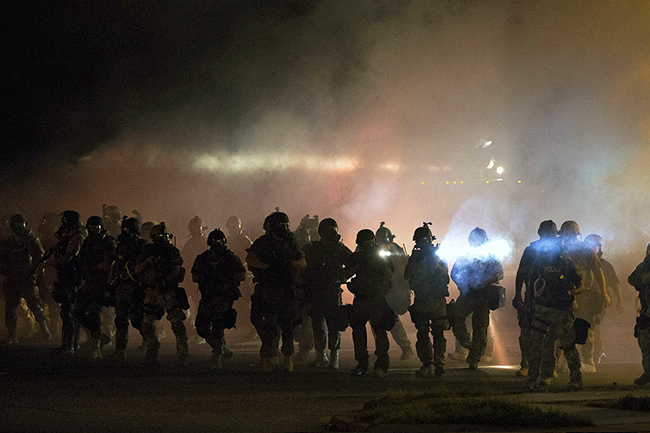 - Полицијску „филијалу“ у самом Фергусону, у којем две трећине становника чине црнци, чувају оклопни транспортери, специјалци наоружани пиштољима и пушкама М4, док хеликоптер непрекидно „виси“ над центром града