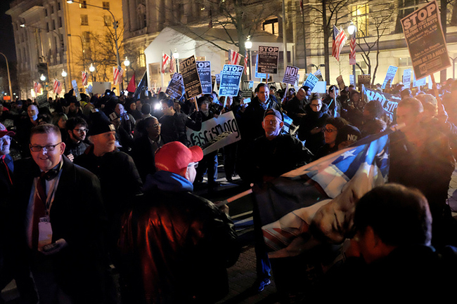 У близини Trump Tower на Менхетну окупило се неколико хиљада људи међу којима су били и градоначелник Бил де Блазио, проповедник Алфред Шарптон, филмски режисер Мајкл Мур и глумци Роберт де Ниро, Алек Болдвин и Марк Руфал.