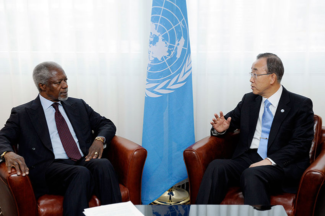 Анан је аутор мировног плана за Сирију. Његов пројекат за решавање конфликта у тој земљи де факто је пропао пошто га нису подржали ни побуњеници ни водеће западне земље које иза њих стоје. И новцем и оружјем.
