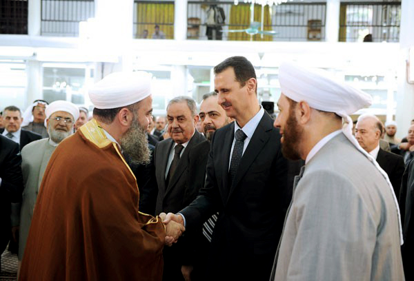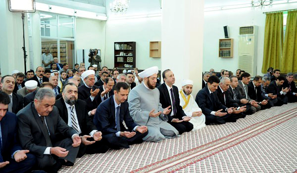 На снимцима које је објавила сиријска државна телевизија, Асад се види у друштву високих верских и државних руководилаца, укључујући и новоизабраног премијера, али потпредседник државе Фарук Схара - за којег побуњеници  тврде да је пребегао у Јордан - није виђен на јутрошњој молитви. Сиријске власти оповргнуле су информацију о пребегу.