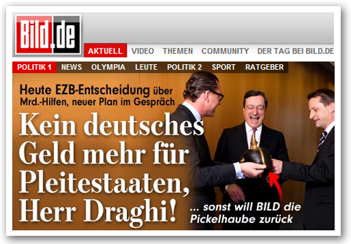 „Нема више немачког новца за банкрот-државе, господине Драги!“, упозорио је Билд већ у наслову изнад слике насмејаног Драгија како прима шлем од уредника листа у свом кабинету.![]()