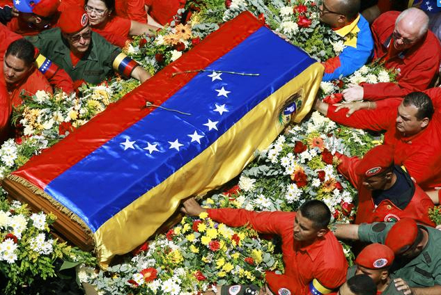 На улицама Каракас биле су многе десетине хиљада Венецуеланаца. Већина је била обучена у црвено. Сви су махали националним заставицама и плакали док је поворка ишла за ковчегом кроз престоницу.