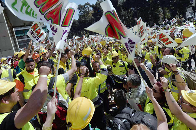 OКО 4.000 рудара протестовало jе данас у Aтини због могућих отпуштања, за коjа страхуjу да ће уследити, због противљења левичарске владе наставку експлоатациjе у руднику злата на северу Грчке.
