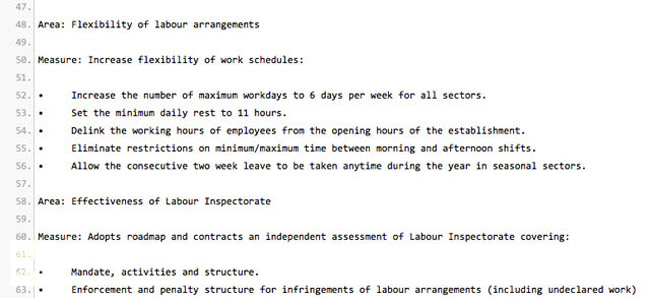 Истим документом, који је некако процурио у јавност, такође се инсистира на „олакшаном режиму отпуштања радника”. А појавио се у време кад Тројка већ отворено тражи од коалиционе владе Антониса Самартаса нове резове од 14,16 милијарди долара.