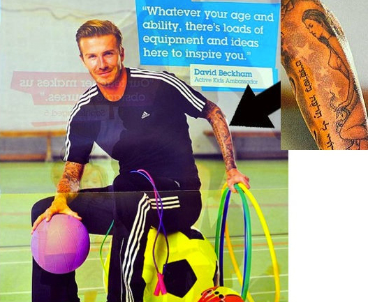 Уз дечије играчке, Бекам је позирао у спортској мајици кратких рукава, са тетоважама на подлактицама. Проблематична је конкретно она на левој, која приказује његову супругу Викторију само у доњем рубљу.