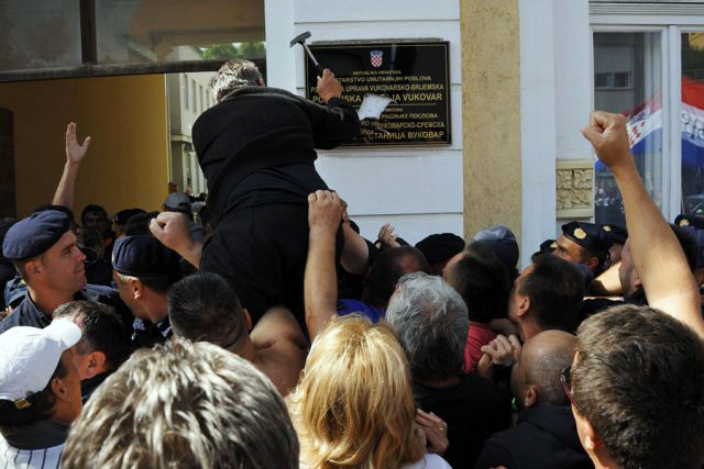 „Бранитељи“ поскидали све двојезичне табле по Вуковару, једино ону на згради полиције - разбили