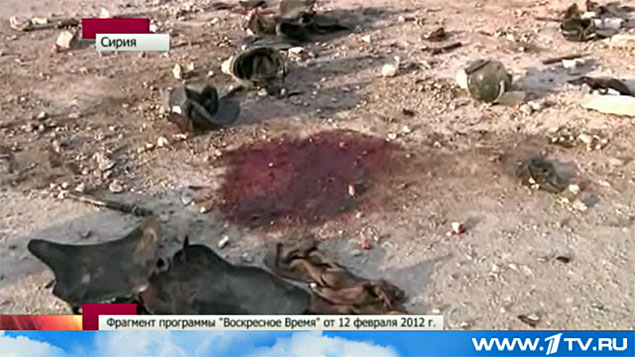 * Аутор Јевгениј Баранов: Још средином фебруара ове године, када је читав свет био потресен вестима о крвопролићу у сиријском Хомсу, које се на чудан начин подударило са руско-кинеским ветом на резолуцију Савета Безбедности УН о Сирији, Први канал је узео за право да претпостави да је то само први корак у реализацији косовског сценарија за решавање сиријског проблема