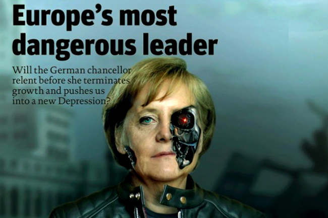 Меркелова у тамној, кожној јакни, леденог погледа и разорене леве стране лица, попут „машине-убице“ из филма „Терминатор“, осванула је на насловоној страни овог британског магазина. Уз оцену да она прети светском поретку и благостању више него ирански председник Махмуд Ахмадинежад или севернокорејски властодржац Ким Џонг-Ун.