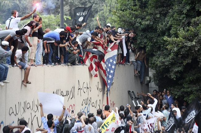 У главном граду Египта стотине демонстраната су покушале да продру у америчку амбасаду. Пошло им је за руком да скину заставу САД и да уместо ње поставе црну на којој је писало: «Нема Бога осим Алаха, Мухамед је његов пророк».