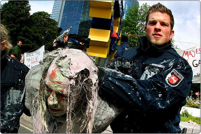 НЕМАЧКА полиција привела је око 400 демонстраната, који су се окупили на мирним протестима активиста „Окупирај Франкфурт“.