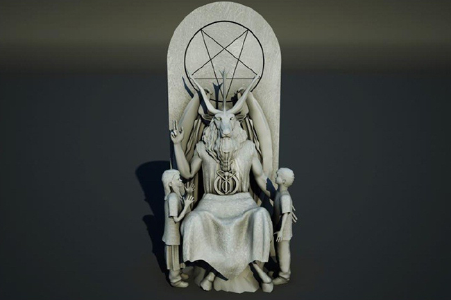Сатана је направљен у облику Бафомета - бића са главом јарца, телом жене, раздвојеним копитима и са два крила. Бафомет седи на трону са пентаграмом (печатом Ђавола), окружен насмејаном децом.