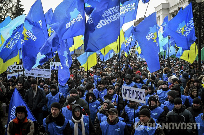 Присталице владајуће партије, независног спољњег курса и тешње сарадње са Русијом тек стижу у Кијев. Очекује се да ће их сутра бити много више од 100.000.