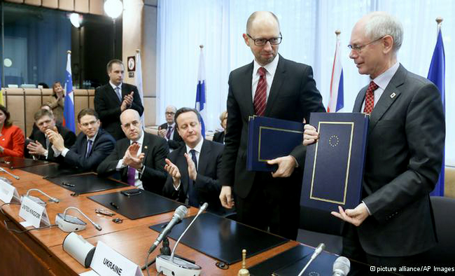Споразум је у име наранџасте Украјине потписао њен вршилац дужности премијера Арсениј Јацењук. ЕУ је поделила споразум на два дела, политички и економски, како би пружила прилику својој украјинској „прелазној влади“ да одмах потпише први.