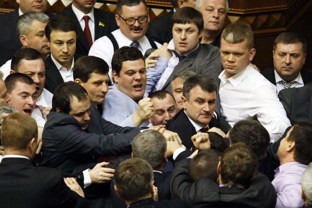 МАСОВНА туча је избила у парламенту Украјине, између посланика националистичке партије Свобода која је у опозицији, и посланика провладине Партије региона, а повод је било коришћење руског односно украјинског језика у парламентарној расправи, јављају агенције и украјински медији.