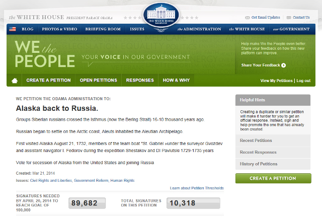 ВИШЕ од 22.000 људи потписало је петицију на сајту Беле куће за сецесију Аљаске од Сједињених Држава и њено присаједињење Русији, пренела је руска агенција РИА Новости.