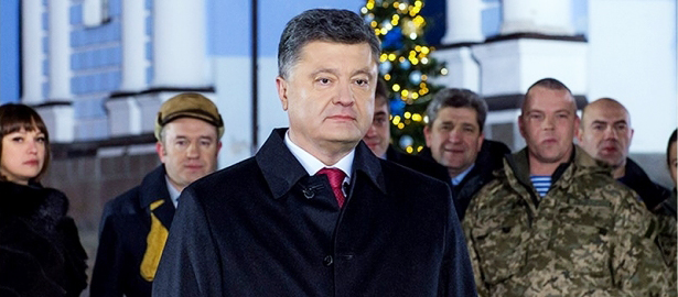 У телевизиjском обраћању у поноћ, он је био окружен воjницима и добровољцима коjи су „делили храну прошле зиме за време протеста“, односно државног преврата у режији америчких специјалних служби који се завршио свргавањем легалног шефа државе Виктора Jануковича.