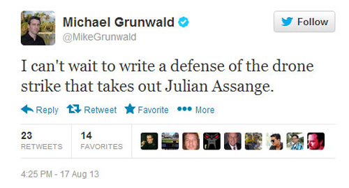 Гринвалд је своју опску-коментар уклонио с Твитера, а у њој је дословно писало: „Једва чекам да напишем одбрану напада дрона који ће убити Џулијана Асанжа”.