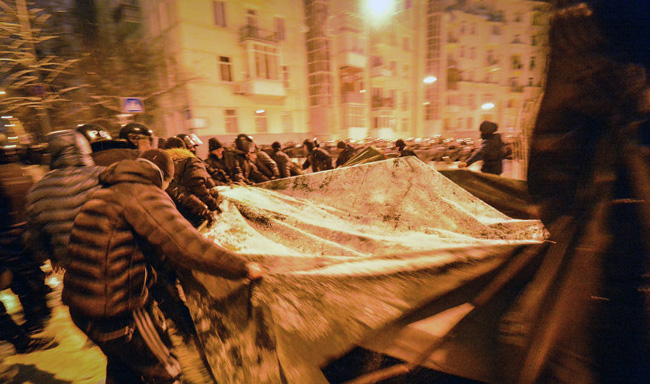 Сат након почетка „јуриша“ – „беркутовци“ су пробили и другу линију одбране Трга независности са стране Институтске улице и већ потискују демонстранте.
