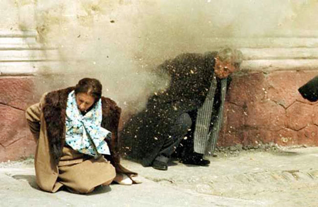 На посебним екранима вртеће се црно-бели снимак суђења и егзекуције - суђење и извршење казне снимљени су видео камером а снимак је у децембру 1989. муњевитом брзином обишао свет.