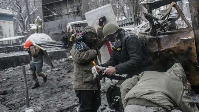 Цео центар града је у диму јер „евромајдановци” између себе и полиције и жандармерије пале аутомобилске гуме. У таквим количинама да је планула једна од зграда у улици Грушевског где је већ четврти дан „најгушће”.