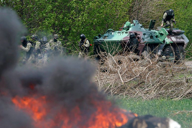 Припадници украјинских специјалних јединица наступали су  са оклопном техником иза леђа и под њеном ватреном заштитом, а имају подршку и из ваздуха. Изнад Славјанска су кружила два хеликоптера украјинске армије.