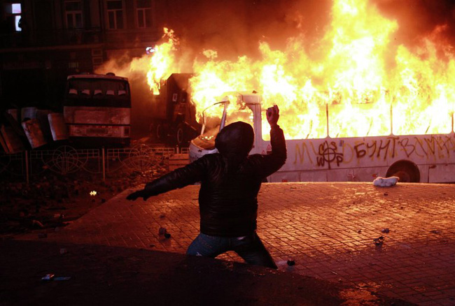 У центру Кијева запаљено пет полицијских аутобуса и два камиона