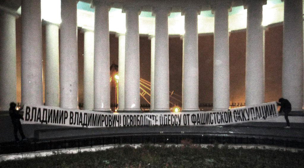 АКТИВИСТИ локалног „Антимајдана“ су окачили у центру Одесе транспарент којим су позвали председника Русије Владимира Путина да ослободи Одесу од фашистичке окупације.