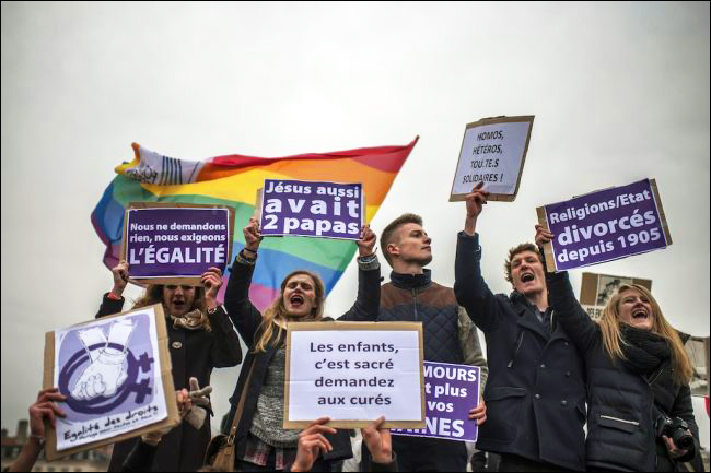Питање геј бракова је поделило Француску, која је званично секуларна држава, али истовремено и претежно католичка. На протестима против овог закона, који су били праћени и насиљем, умело је протеклих месеци да се окупи и више стотина хиљада људи.