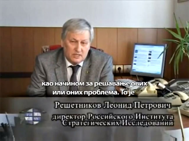 Леонид Петрович РЕШЕТЊИКОВ, директор РИСИ: Ми не смемо, а то и чинимо, никада да се миримо са спољним интервенцијама, као начином за решавање ових или оних проблема. То је недопустиво чак и ако САД – замислимо то апстрактно - стварно имају један једини циљ – да демократизацију неку земљу, како то они схватају, али је то апсолутно фантастичан појам да једна земља демократизује другу земљу и њену унутрашњу политику.