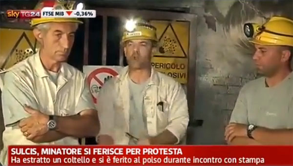 ЈЕДАН од очајних италијанских рудара, који се се забарикадирали у руднику на Сардинији, пререзао је себи - уживо пред ТВ камерама које су снимале прес конференцију с рударима - ножем вене на руци.