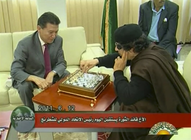 Председник ФИДЕ Кирсан Иљумжинов, који је више пута посећивао Либију, открио је високотиражном руском дневном листу «Московски комсомолец» садржину свог последњег телефонског разговора са пуковником Моамером ел-Гадафијем. При том је проментарисао и манипулацију са слављем побуњеника на Зеленом тргу Триполија и говорио о суштини либијског конфликта и будућности Џамахирије.