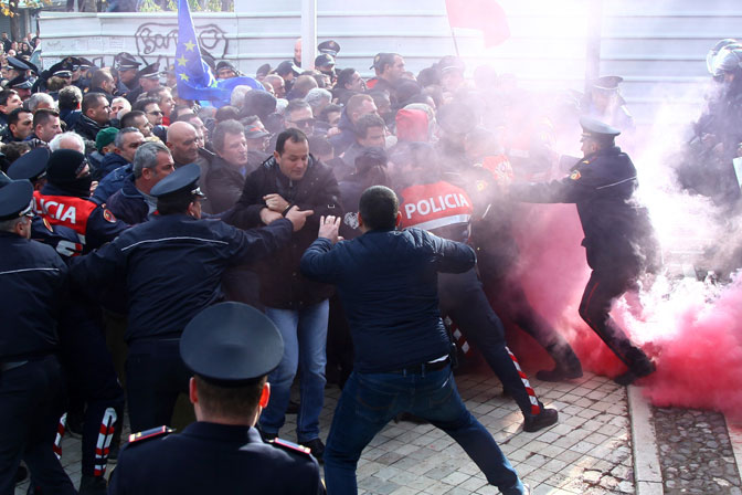 СУКОБ ПОЛИЦИЈЕ И ПРИСТАЛИЦА ОПОЗИЦИЈЕ ИСПРЕД ПАРЛАМЕНТА АЛБАНИЈЕ