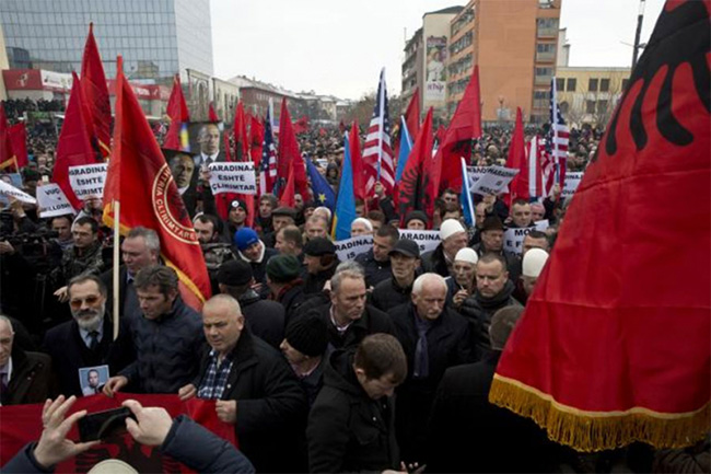 На протесту је затражено безусловно ослобађање Харадинаја, који на условној слободи чека да француске власти размотре захтев Београда да га изруче Србији због оптужби за ратне злочине током сукоба на Косову.