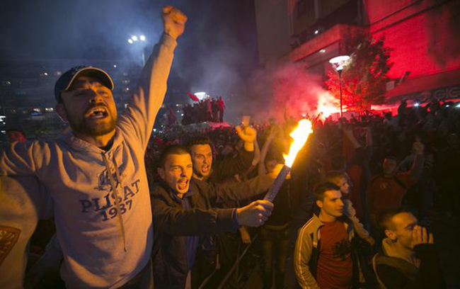 ПОСЛЕ инцидента због кога је прекинут меч фудбалских репрезентација Србије и Албаније у Београду, у центру Приштине је настало славље уз ватромет, музику и узвикивање „Албанија, Албанија”.