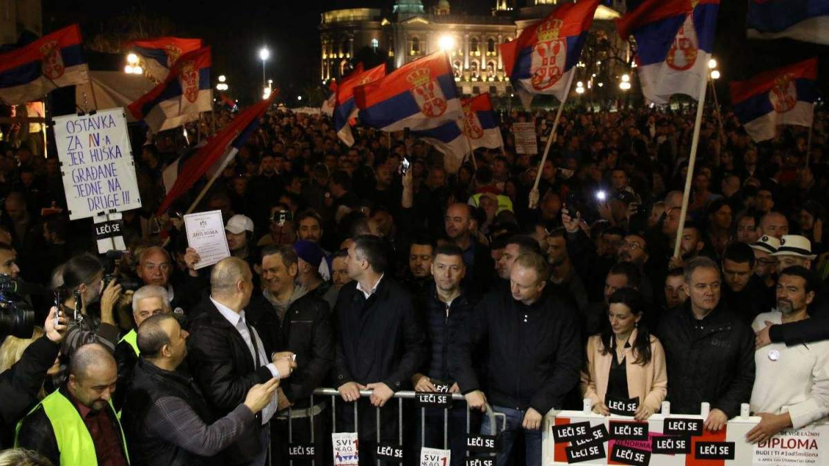 ПРОТЕСТ Један од пет милиона почео је испред Владе Србије нешто после 18 часова интонирањем химне "Боже правде" и минутом ћутања за жртве шестоаприлског бомбардовања 1941. године у Београд.