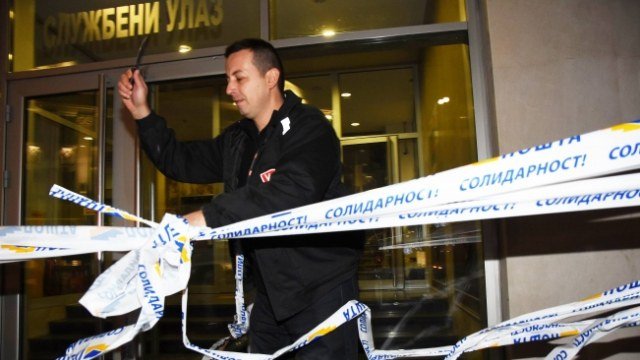 Демонстранти су потом зграду поште почели да излепљују лепљивом траком са натписом "Солидарност пошта", када је један од радника обезбеђења "Поште Србије" са ножем у рукама почео да сече траке, а потом се повукао назад у зграду.